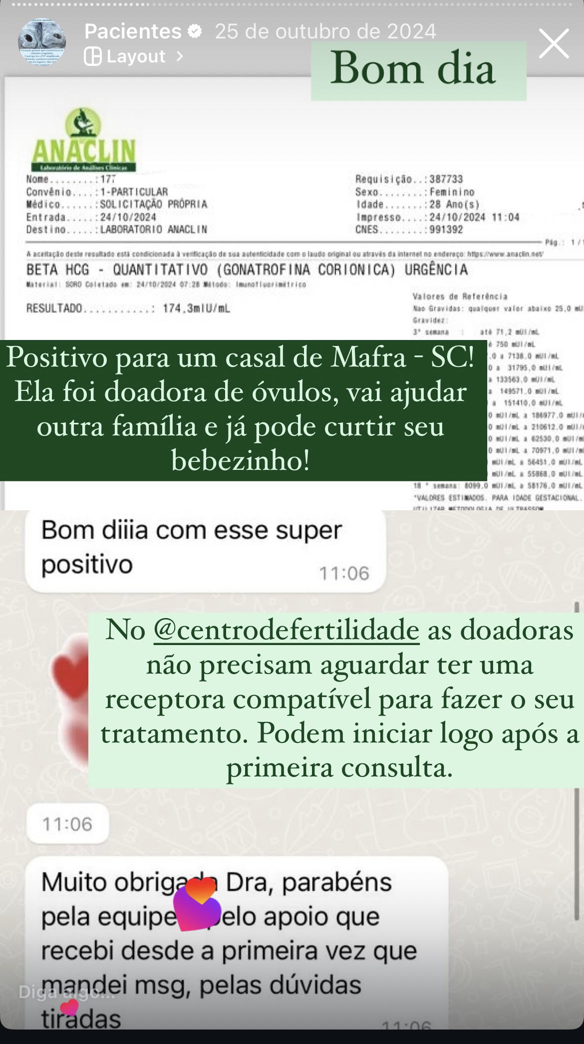 | Fila de espera para a doadora | ✓ Sem fila |